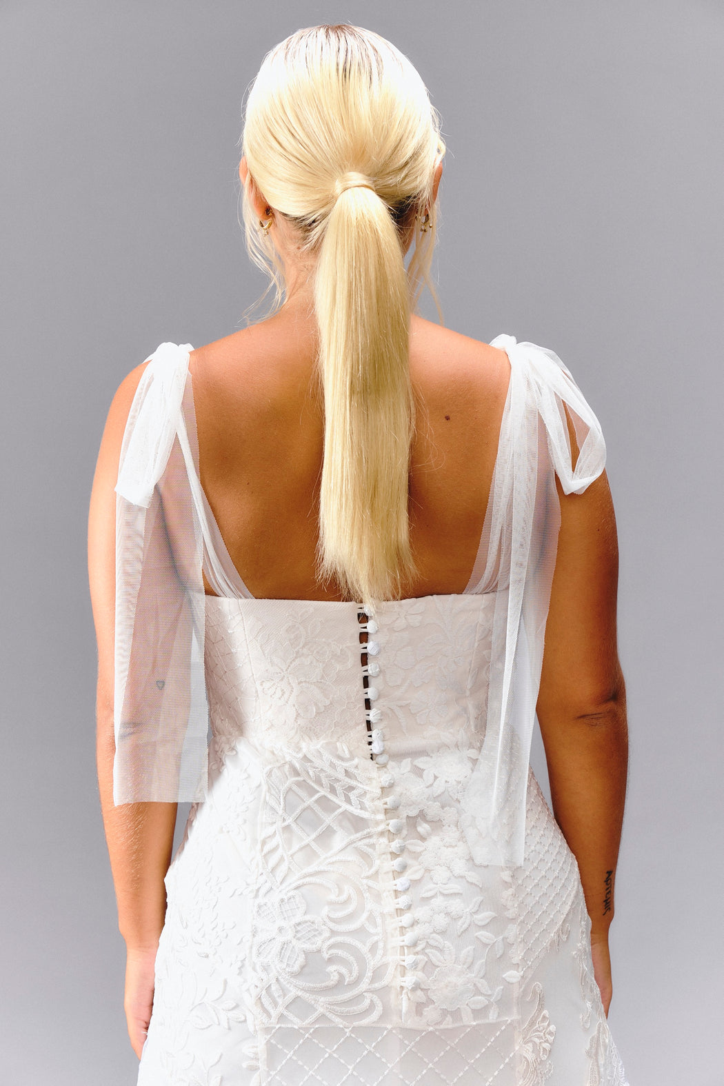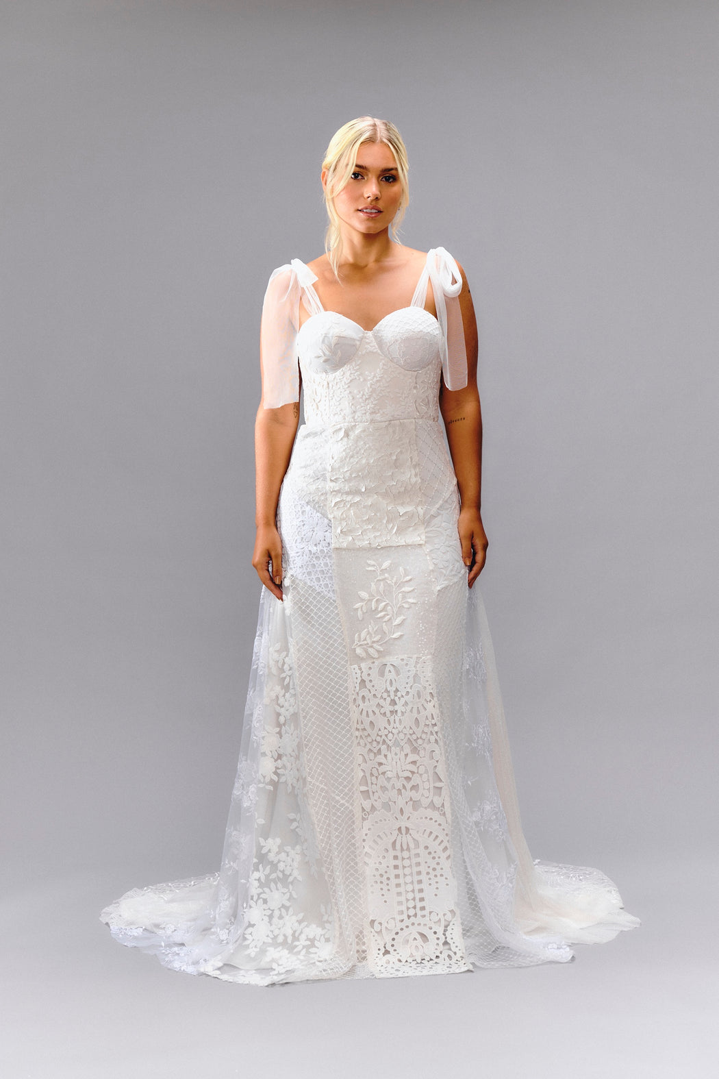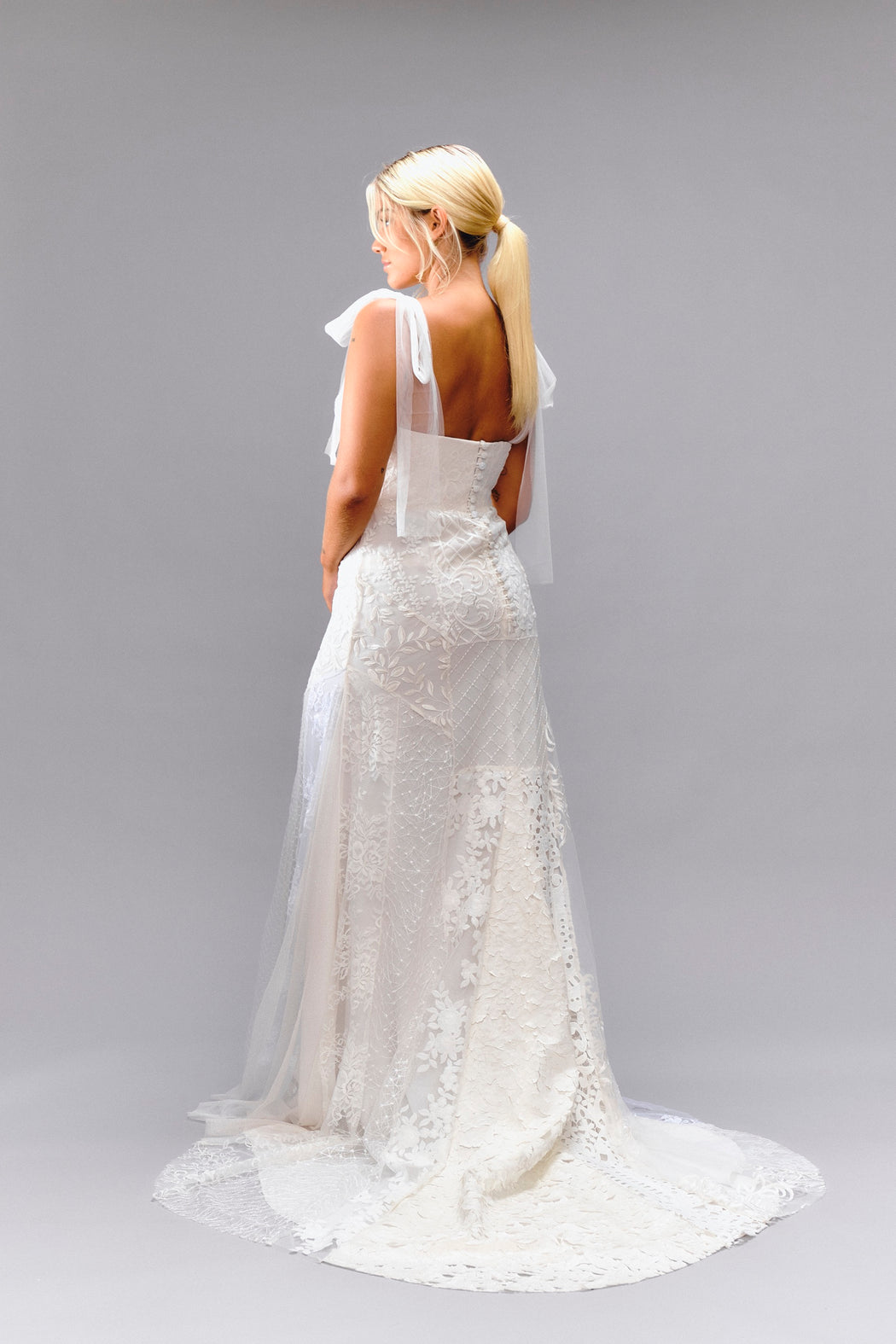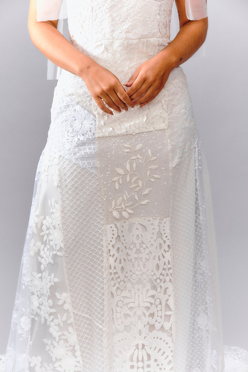 Vestido feito todo em patchwork de rendas com saia sereia e cauda. Corselet com bojo marcado e alça de tulle com laço. Fechamento em botões forrados de rendas variadas.